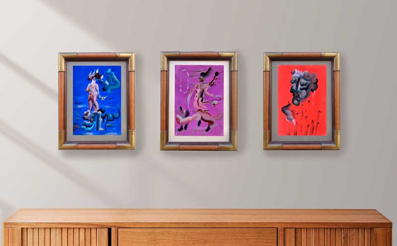 Gallery Display Featuring a curated selection of recent paintings on vibrant backgrounds, 2024