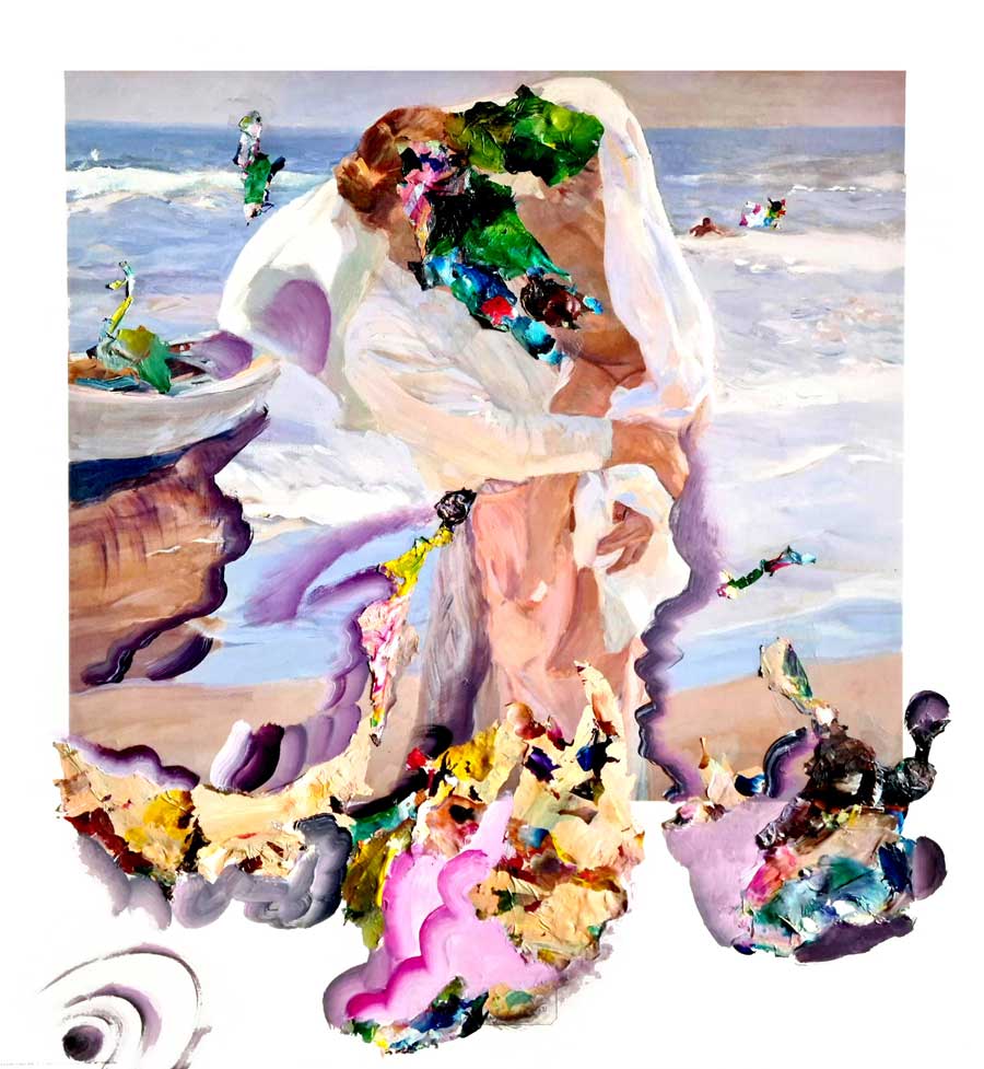 These two works Daughters On The Beach and Mothers On The Beach began with a found image: a print of a beach scene by the celebrated Valencian painter Joaquín Sorolla, discovered within one of two vintage frames Marianna came across in a second-hand shop. Drawn to the quiet history embedded in these objects, she chose to intervene upon the existing image, layering fragments of her own visual language over Sorolla’s luminous shoreline.