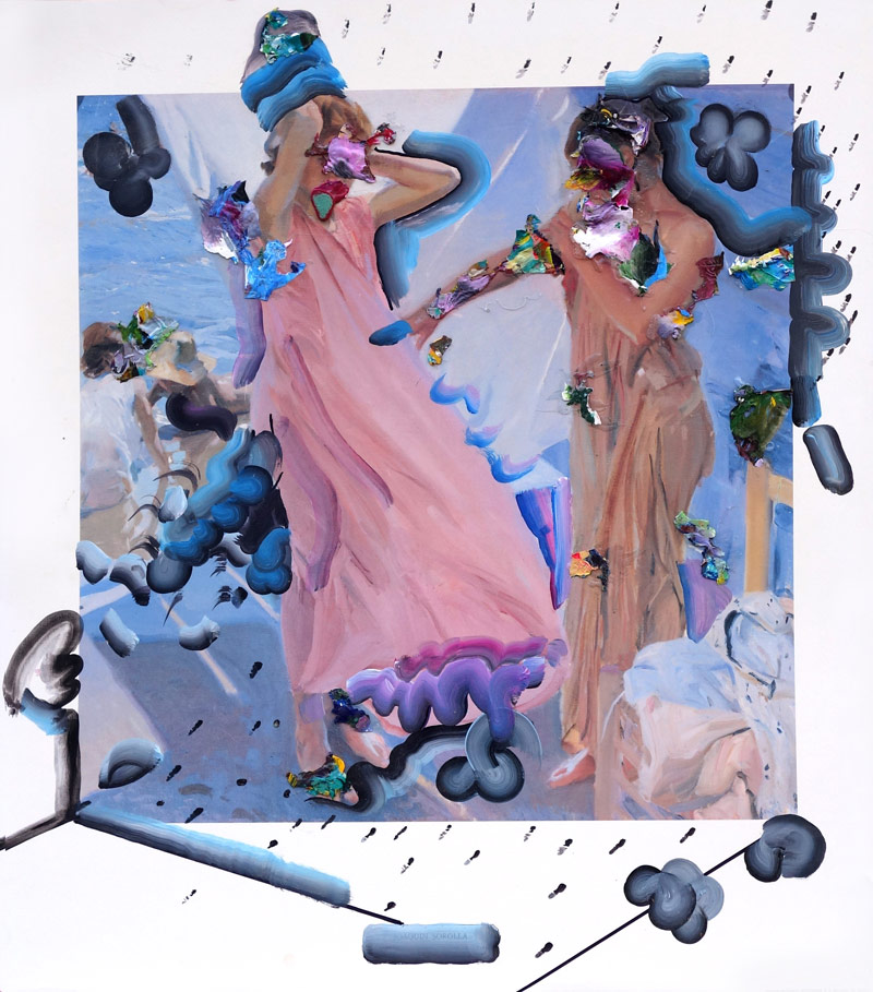 These two works Daughters On The Beach and Mothers On The Beach began with a found image: a print of a beach scene by the celebrated Valencian painter Joaquín Sorolla, discovered within one of two vintage frames Marianna came across in a second-hand shop. Drawn to the quiet history embedded in these objects, she chose to intervene upon the existing image, layering fragments of her own visual language over Sorolla’s luminous shoreline.