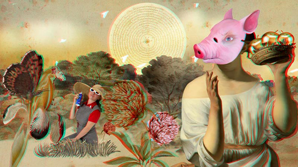 From Inside a Beehive and Back Again invites us as viewers to peer in through a piece of garden décor to bare witness to a possibly female alien humanoid's experience in an undefined moment in time. Each environment she exists in holds its own sense of artificiality and malleability, almost like going deeper into a virtual subconscious. Who holds the power over these spaces, these things? Where did she come from and where is she going? Is she an abstraction of the contemporary suburban woman or just a figment of our imagination?