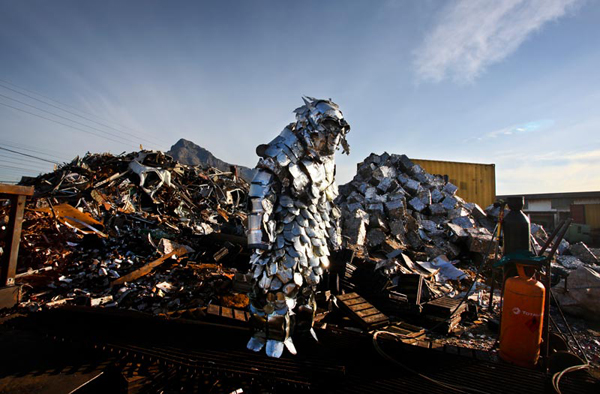 Francois Knoetze has constructed six wearable sculptures entirely out of waste. Rather than merely disposable items which are purged from our lives, as soon as the garbage truck disappears around the bend or which lie dormant in an ever-widening layer in the crust of the earth for future archaeologists to marvel at Cape Mongo imagines trash objects specifically, the packaging of domestic consumables and the electronic devices used to record every-day life as mnemonic vestiges of the activities that shaped them. Performing all over the city of Cape Town for a period of two years, Cape Mongo is the documentation of these performances but also pulls together found footage relating to various issues around housing, food security, inequality and racial segregation.