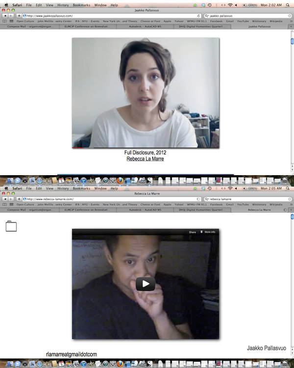 The process of becoming one, as part of Full Disclosure, required a great deal of trust and negotiation; it was an experiment that was mutually entered into with, on my part, little thought about where it might take us both.* It also took a certain amount of commitment to sharing my experience of the process, and having to accept and stay with the parts that were uncomfortable. The project has probably been more successful than most of my romantic relationships in this sense. It also felt oddly sexual in the way the phrase “two become one” intimates, odd in a queer sense that involved my body but only to the extent that it was working and work can be pleasurable, and also odd because it was completely a-romantic.