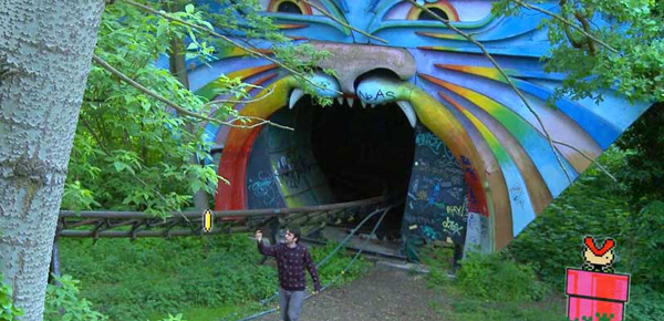 In the Berlin city everyone is going crazy for a viral new app. Anyone with a smartphone can play a sort of Super Mario Bros arcade game in Augmented Reality and win Bitcoins by playing. One coin corresponds to 0.01 Bitcoins. Citizens' habits are tainted by the game. Coins are hidden all over the city, you can spot them just scanning around with your device, not always they are easy to grab. People started to leave their jobs in order to collect Coins in the streets. All over the city people are jumping and running around with their smartphones, trying to grab as many virtual coins as they can, while the App developers identity remain covered. The 14 minutes movie is divided in chapters or "levels" which follows the 8bit vintage graphic and introduce to the following events with a small 8 bit animations. Peculiar elements of the Berlin city become part the Super Mario Land landscape, see those pink or blue tubes that run everywhere in the city, those climber plants popping out from wild abandoned place like old factories, longlines, gardens, those those east side building made with old red bricks, and the brige Oberbaumbrucke on the Spree river which seem the exact copy of the Super Mario's final boss castle. In these scenery there are now people chasing coins by jumping around the city, people sailing on small boats on rivers, people losing their job and falling from bridges… and so on, while nobody knows who is giving them all that money and why. During the movie, acknowledged bloggers, hackers, game developers, financial expert are interviewed. The shooting itself appear to be a game in the game: all the interviewees are asked to imagine the city as the app release happened for real and to answer thereby, sometimes they are even asked to play with it, but their skills and knowledge in the field allows to raise important questions on the actual use of internet, social networks and virtual currencies. Part of the work is dedicated to the Bitcoinkiez, a small Berlin district where local owners started to sell their products in Bitcoins through the Bitcoin Wallet App, which would be the "real" app to whom the Super Mario app is corresponding and who holds a world record: no other neighborhood in the world is so densely populated with commercial activities that accept the Bitcoin as a valid currency.
